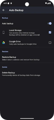 Daily auto backup to local storage and/or Google Drive. Use calendar to select any day in the last month and restore habits / goals if needed.